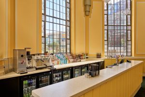 Nestled between grand Art Deco columns, the Gaumont Room bar was installed to serve this versatile multi-purpose space. A flexible basket system was incorporated to allow glassware to be changed to suit each event, from high-end banqueting to breakout sessions from the main auditorium.